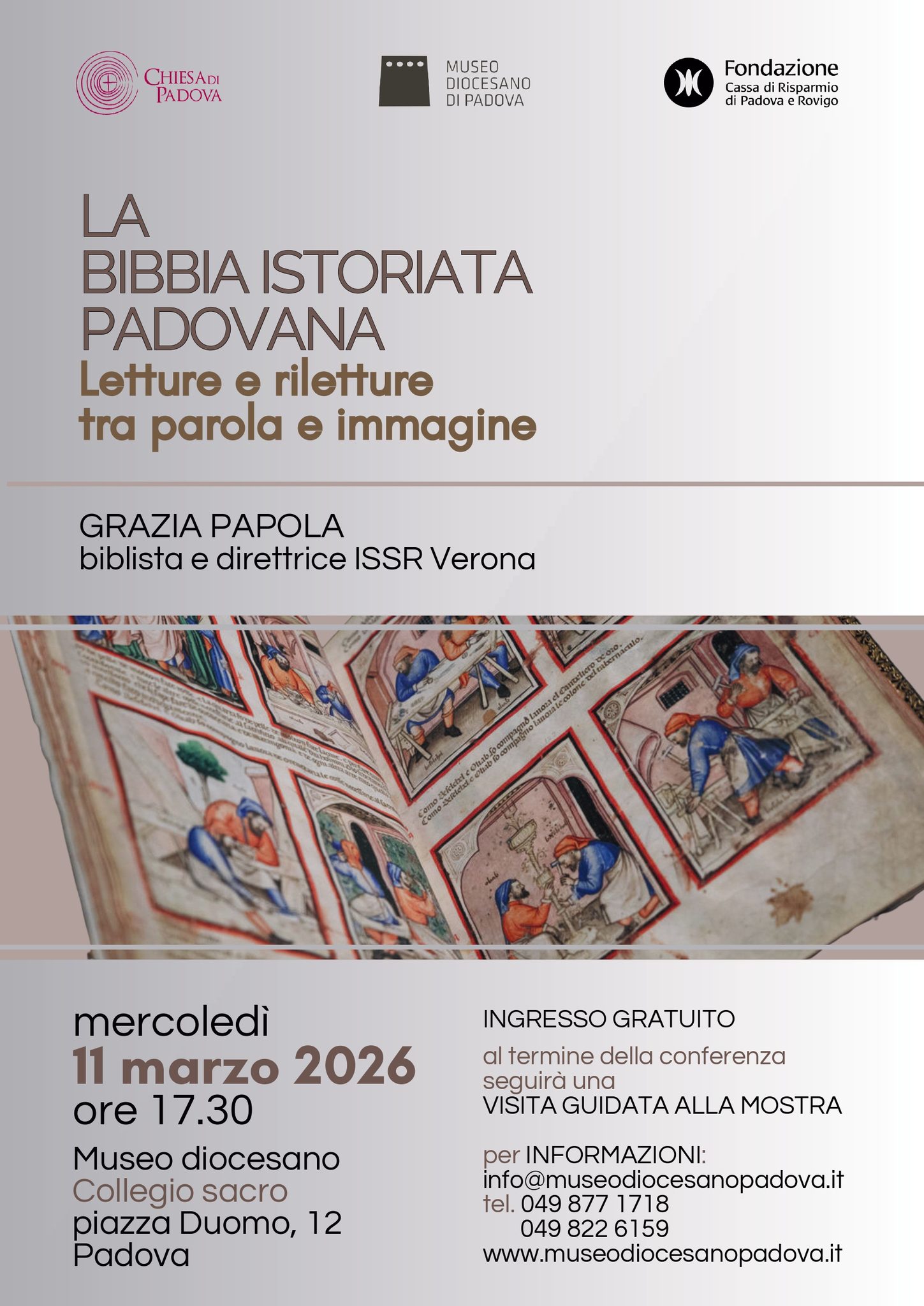 Appuntamento speciale e straordinario per approfondire il tesoro racchiuso nella Bibbia Istoriata padovana esposta nel contesto del Salone dei vescovi del Museo diocesano di Padova. Mercoledì 11 marzo, alle ore 17.30 sarà suor Grazia Papola, biblista e direttrice dell’Istituto superiore di Scienze religiose di Padova a tenere una conferenza dal titolo “ La Bibbia istoriata padovana. Letture e riletture fra parola e immagine”.